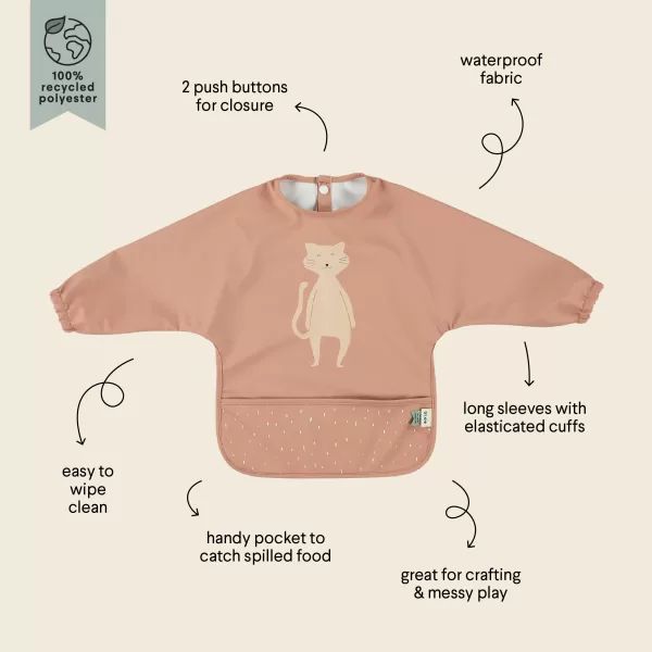 Divertimento e risate a tavola con il tuo amico animale preferito! Questo allegro bavaglino è dotato di pratiche maniche lunghe e mantiene puliti i vestiti del tuo bambino mentre ti godi un buon pasto, una bevanda o uno spuntino. La pratica tasca assicura che tutto il cibo versato venga raccolto ordinatamente, creando molto meno disordine. Altre buone notizie: il tessuto è impermeabile e realizzato al 100% in poliestere riciclato! È facile da pulire e ti fa risparmiare molto tempo di lavaggio o pulizia.