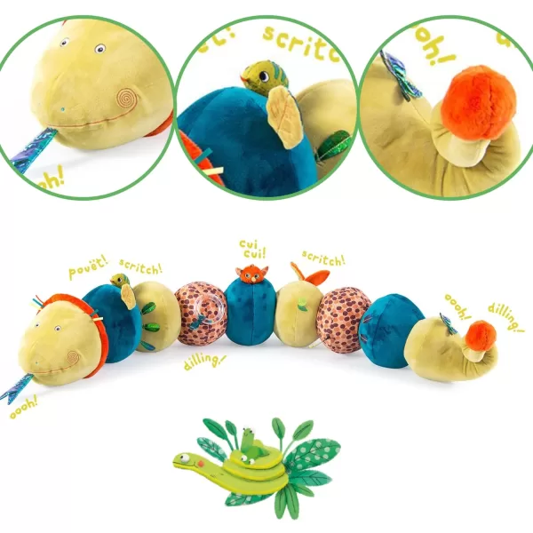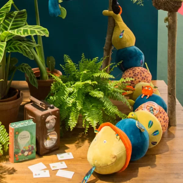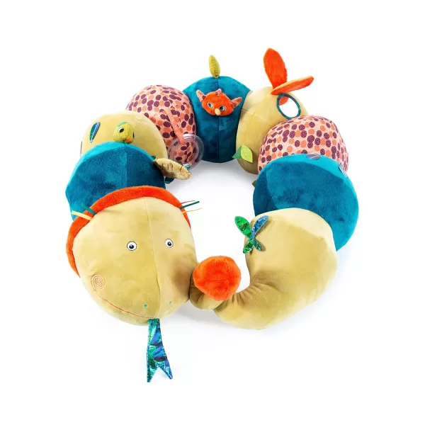 Questo serpente è pieno di sorprese! Ha campanelli, un pulcino appeso che suona, un sonaglio con perline, un camaleonte con popi-popi, una farfalla con carta croccante e uno specchio per far divertire il bambino… Nella coda un altro sonaglio!