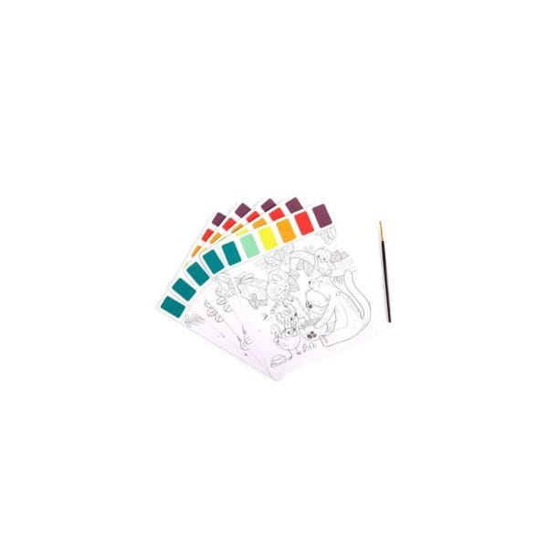 Una tasca con 10 illustrazioni dei personaggi della giungla da dipingere usando il pennello e la tavolozza dei colori integrati. Basterà un po’ d’acqua per diluire la vernice e andiamo a colorare i loro capelli arruffati!